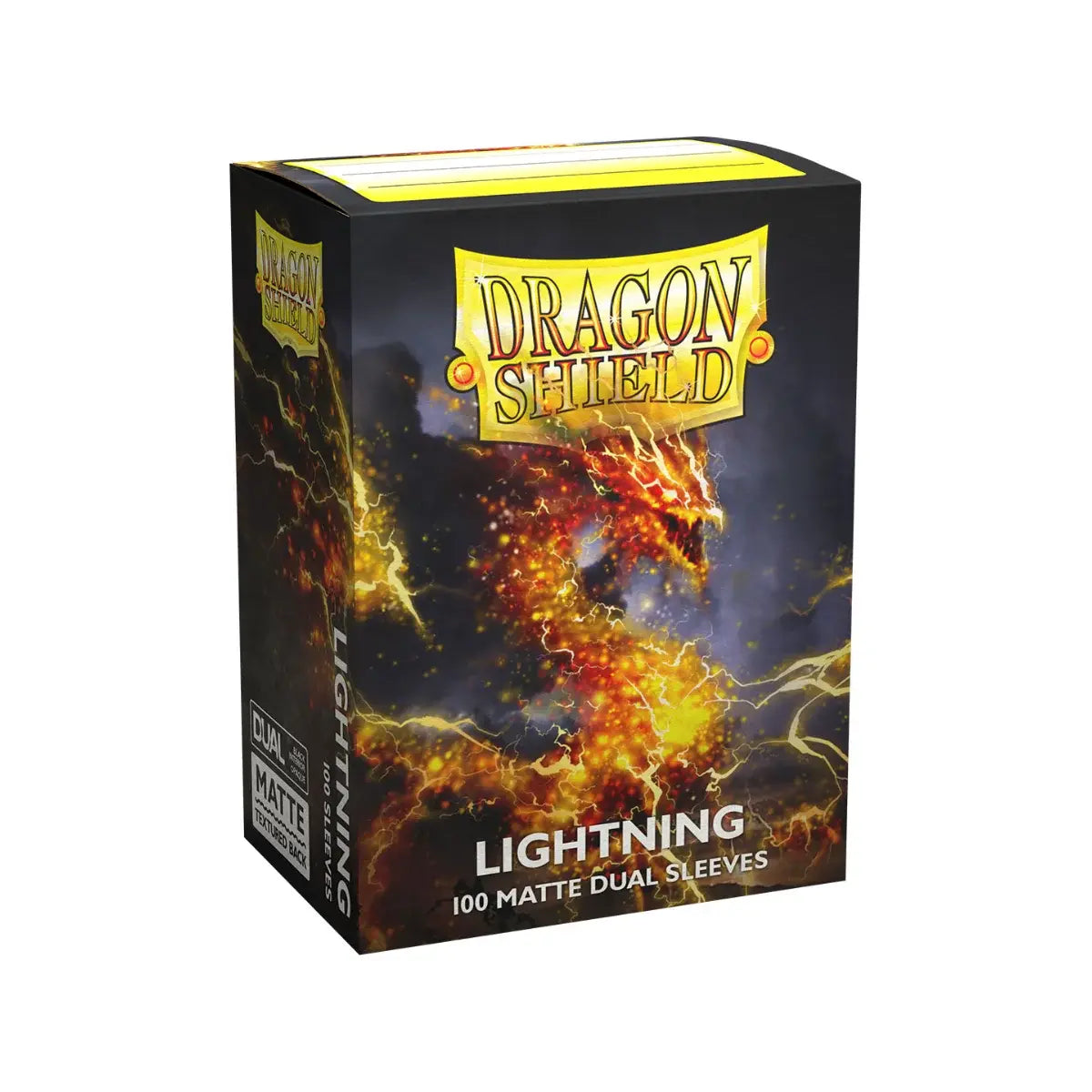 Lightning, bold and impactful! Dragon Shield Dual Matte sleeves. Clear front and a textured matte back. Fully opaque sleeves with a black interior, an elegant backdrop for black bordered cards. The sturdy cardboard box fits 75+ single sleeved cards or 65+ double sleeved cards. Every box has a label on the top for personalization.
