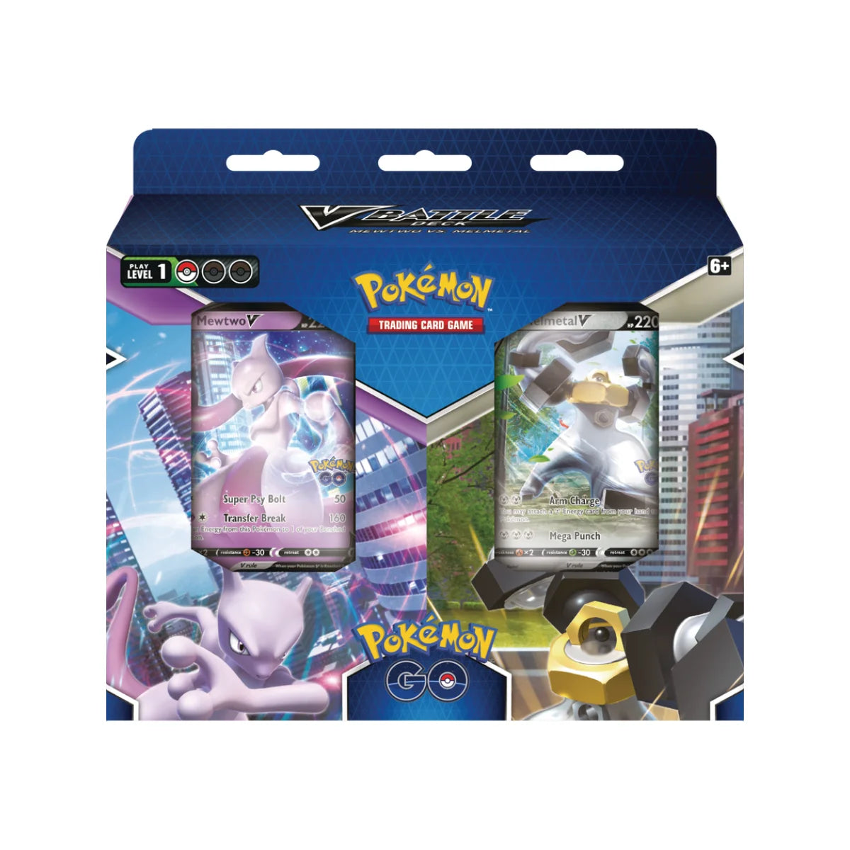 Face off with Mewtwo V or Melmetal V! This Pokémon GO V Battle Deck bundle includes 2 ready-to-play decks, foil promos, booster packs, and battle accessories.