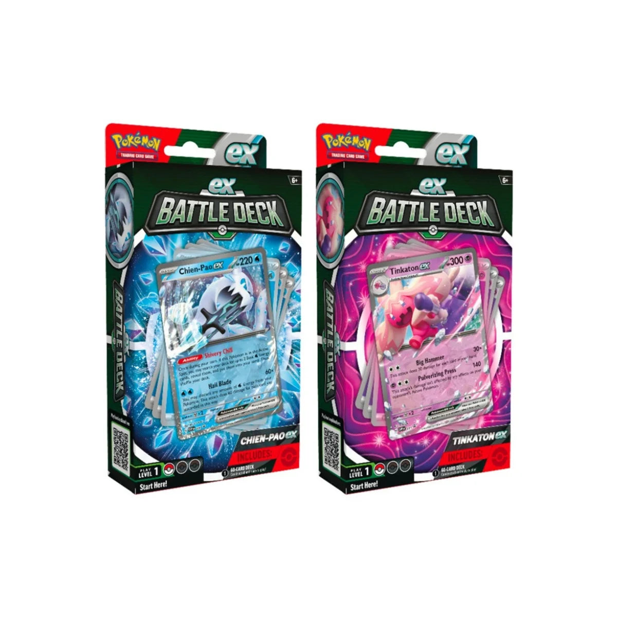 Mighty Pokémon ex Battle for Victory! Powerful Pokémon ex are ready to charge onto the battlefield in two new PokéTCG: ex Battle Decks featuring Chien-Pao ex and Tinkaton ex! Each 60-card deck is led by an exceptional Pokémon ex and includes everything you need to play right away. Let the battle begin!
