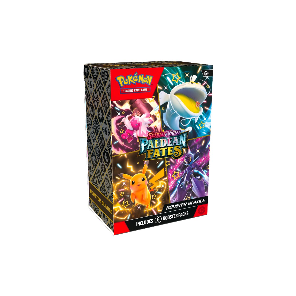 Shine Bright with Pokémon from Paldea!The spotlight glistens on Shiny Pokémon making their fated return to the Pokémon TCG! Shiny Pikachu blazes the path forward as Tinkaton, Ceruledge, Dondozo, and more than 100 other Shiny Pokémon follow. Meanwhile, Great Tusk and Iron Treads appear as Ancient and Future Pokémon ex, and Charizard, Forretress, and Espathra show off their own unique skills as Shiny Tera Pokémon ex. Shed some light and discover sparkling wonders in the Scarlet & Violet—Paldean Fates expansion!Expand your collection with this Booster Bundle containing six booster packs from Pokémon TCG: Scarlet & Violet—Paldean Fates!Includes six booster packs from the Pokémon TCG: Scarlet & Violet—Paldean Fates expansionEach booster pack contains 10 cards and 1 Basic Energy. Cards vary by pack.